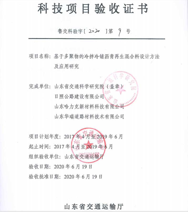 6月19日,我公司參加的“基于多聚物的冷拌冷鋪瀝青再生混合料設(shè)計方法及應(yīng)用研究”課題,順利通過了山東省交通運輸廳組織的成果驗收和評價工作。